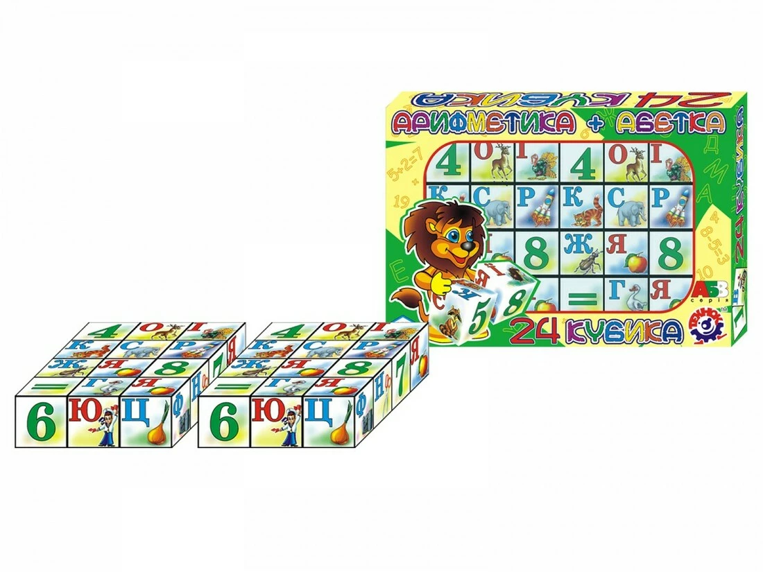 Вага 360 г Габаритні розміри 28?20?4.5 см Набір складається з 24 кубиків з цифрами, буквами української абетки і малюнками. На кожній грані кубика - буква і зображення предмету, назва якого починається на цю букву, або цифра та відповідний цифрі малюнок. Упаковано в картонну коробку.