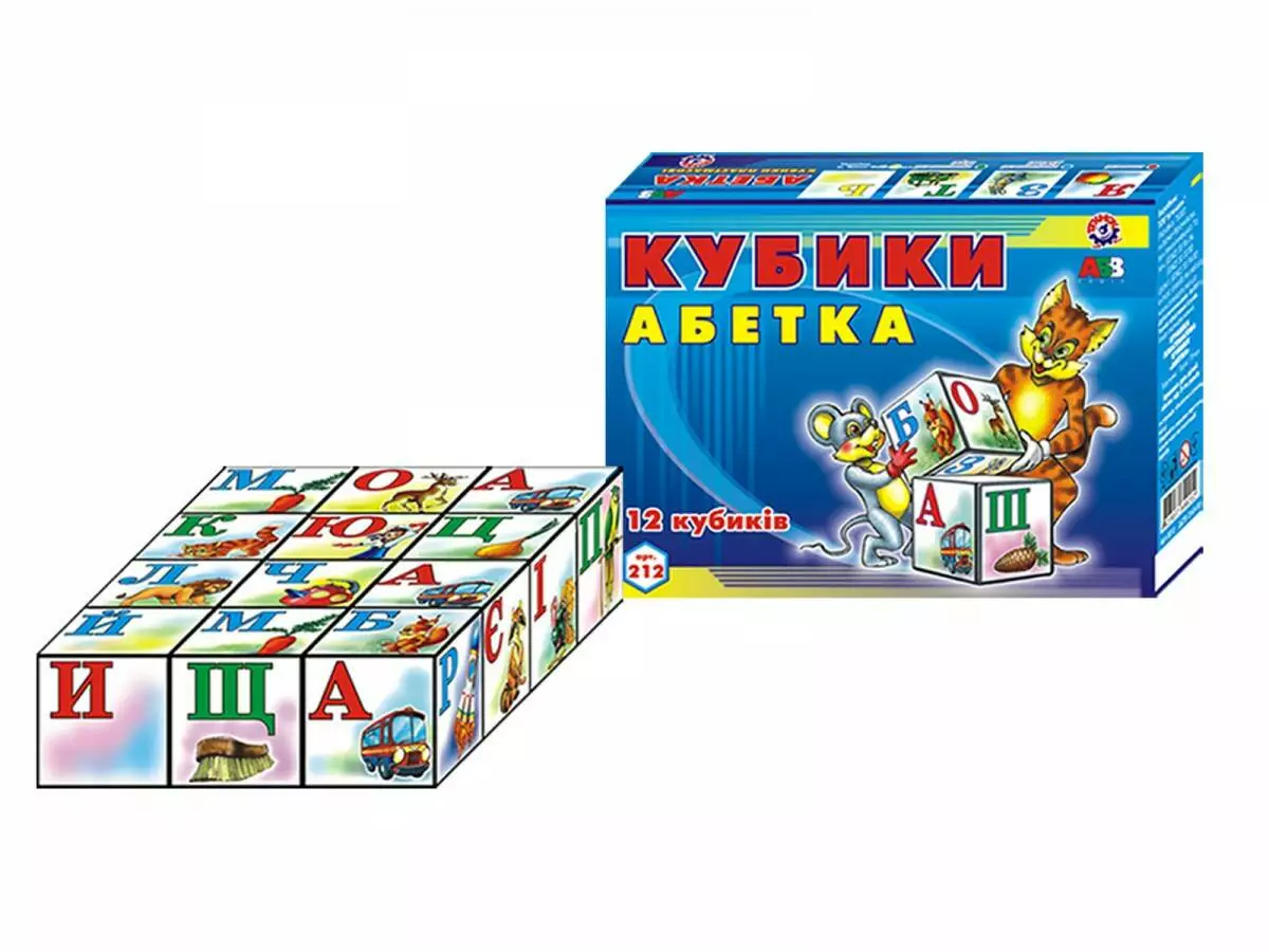 Набір складається з 12 кубиків з буквами української абетки і малюнками. На кожній грані кубика - буква і зображення предмету, назва якого починається на цю букву. Упаковано в картонну коробку.