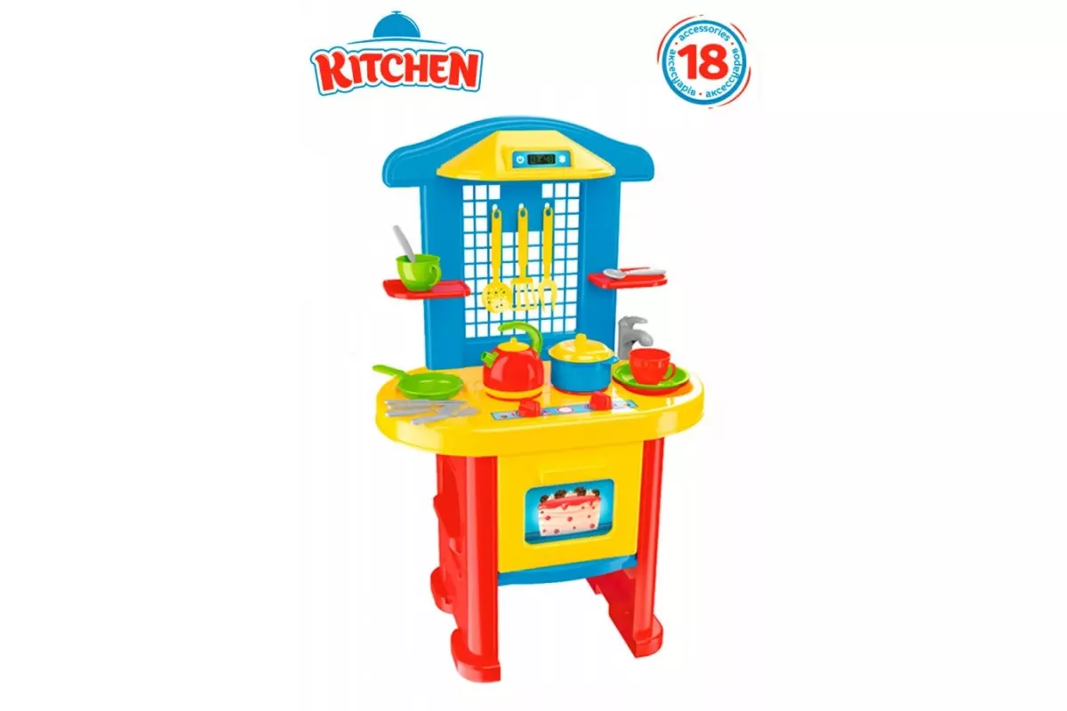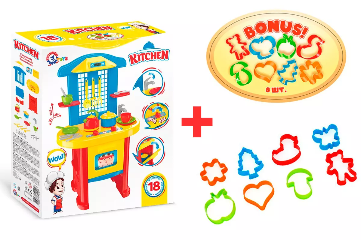 Правильно підібрані іграшки допомагають дітям краще пізнавати світ, дізнаватися щось нове та розвивати таланти. Важливо, щоб іграшки були зрозумілими та створеними на основі знайомих дитині речей. Посуд та кухонне приладдя – це перші предмети побуту, з якими знайомиться малюк, адже зустрічає їх щодня. Саме тому кухні та іграшковий посуд такі цікаві для всіх діточок. Іграшкова "Кухня ТехноК" дозволить діткам відчути себе справжніми шефами. На кухні є дві конфорки з ручками, що повертаються та імітують включення газу, гачки, полички для посуду та велика духовка з дверцятами. У наборі також є різноманітний посуд для приготування корисних страв та сервірування святкового столу. Після смачної вечері треба помити посуд – для цього є мийка з краном. Висота кухні у зібраному вигляді 75,5 см, а ширина стільниці 48 см. Біля широкої стільниці зручно гратися двом, а може й трьом діткам. Іграшкова "Кухня" від Технок - чудовий вибір для сюжетно-рольових ігор. Вони добре розвивають координацію, фантазію, комунікативні здібності та мислення дітей, допомагають сформувати навички приготування їжі, прибирання, вивчити правила поведінки з технікою на кухні. Іграшка виготовлена з нетоксичного міцного пластику без запаху. Використання тільки високоякісних барвників забезпечує яскравий колір протягом тривалого терміну використання. В комплект посуду входить: сковорідка, чайник, каструля з кришкою, 2 глибокі тарілки, 2 чашки столові та кухонні прибори. Пакування – яскрава коробка з ручкою (58 х 48 х 15,5 см).