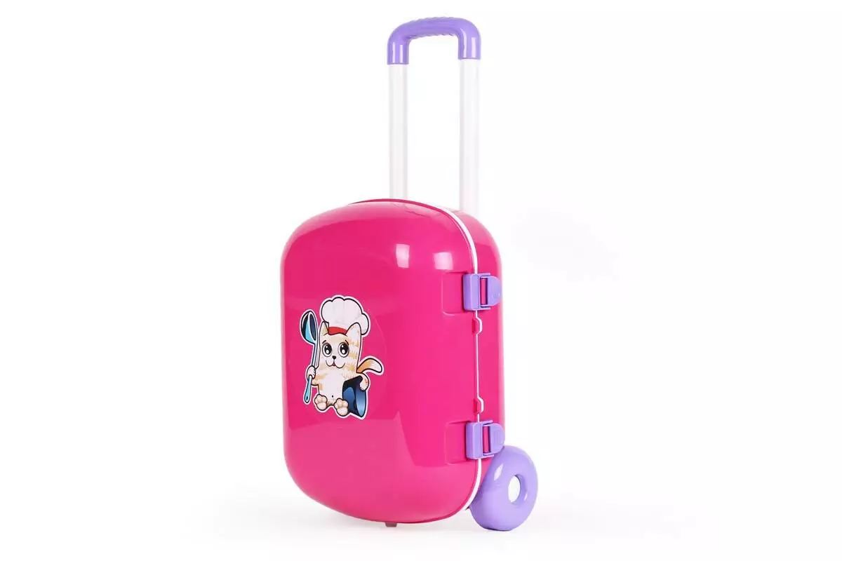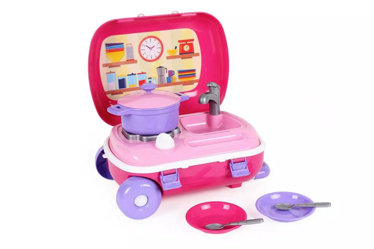 Іграшку «Кухня з набором посуду ТехноК» вигідно вирізняє її дизайн: іграшкова кухня із посудом продається у яскравій рожевій валізі. Такий варіант іграшки «два в одному» є справді цікавим для діток. На малечу очікують приємні хвилювання з приводу того, що ж всередині валізи, інтрига в процесі її розпакування та, зрештою, довгоочікувана винагорода — захопливі ігри з кухнею, посудом і валізою. Валіза має великі міцні колеса, зручну ручку, що регулюється та надійні защіпки. Це дозволяє дитині вільно перевозити кухонний набір у ній. Відкрита кришка валізи фіксується у кількох положеннях, а на її внутрішній стороні є цікава наклейка, що імітує кухонну полицю. Іграшка «Кухня з набором посуду ТехноК» виконана у рожевій кольоровій гамі, що сподобається юним куховарочкам і вони легко «приготують» свої кулінарні шедеври навіть під час мандрівок!