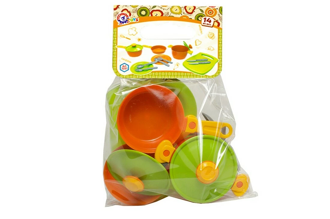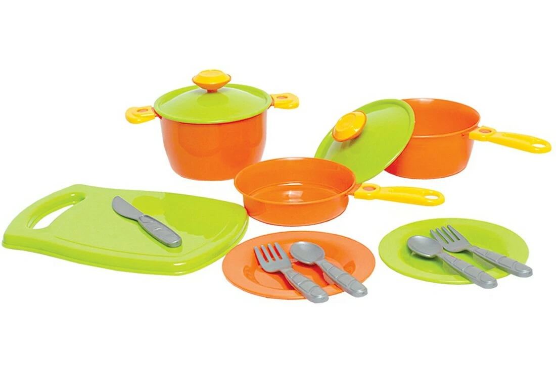Вага 180 г Габаритні розміри 34 ? 40 ? 40 см Набір кухонний - чудова іграшка для майбутніх господинь. Набір складається (14 елементів) з сотейника, сковорідки, каструлі, дощечка для нарізки, кришка - 2 шт., тарілка - 2 шт., ложечка - 2 шт., виделка - 2 шт., ніж - 2 шт. Особливу привабливість посуду надають кольорові ручки сковорідки, каструлі та інших елементів. "Родзинкою" набору є кухонна дощечка.