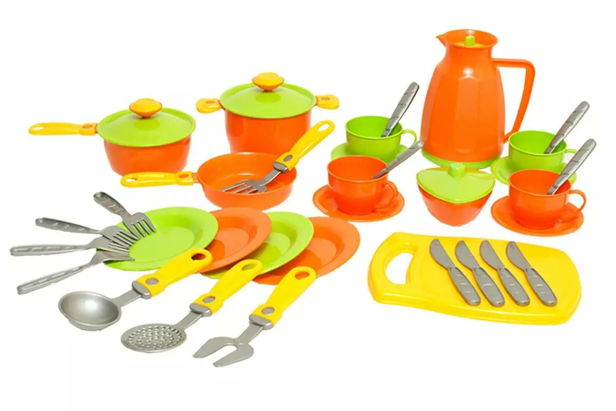 Дитячий кухонний набір, який тепер може бути завжди і всюди разом зі своєю маленькою господинею. Іграшковий посуд упакований в яскраву гофрокартонну коробку і малятко зможе брати її з собою на прогулянку. У кухонному наборі все по-справжньому, як у дорослої мами. В розпорядженні маленької господині 38 елементів ( в т.ч. кавник та дощечка для нарізки) виконаних у оригінальній кольоровій гаммі модельної лінійки Кухонних наборів ТехноК.