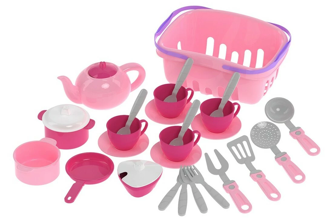 Кухонний набір в кошичку - справжня знахідка для маленької господині. Яскраві кольори і різноманітність посуду неодмінно привернуть увагу малюків. У наборі є все необхідне для приготування смачних страв і зустрічі гостей. Дві каструльки і сковорідка для втілення різноманітних кулінарних задумів. Шумовка, черпак і лопатка зроблять процес приготування максимально реалістичним. А щоб порадувати гостей ароматним чаєм - чайник з кришкою, цукорниця, ложечки і чашки на блюдечках. Всі іграшки розміщуються в кошичку з двома ручками. Так посуд можна брати з собою на прогулянку і влаштувати справжній пікнік для друзів. Удома ж іграшки зручно зібрати в кошик і зберігати в дитячій кімнаті. Кухонний набір в кошичку стане улюбленою іграшкою маленької господині. Він прекрасно доповнить ігрову кухню Вашого малюка. Господині будуть з радістю готувати смачні борщі, соковиті стейки та інші кулінарні шедеври. Такі сюжетно-рольові ігри допоможуть Вашим дітям проявити гостинність, привчать дотримуватися порядку і бути акуратними. З іграшковим посудом діти вивчають основи сервірування столу і кулінарії. Всі елементи набору виготовлені з міцного якісного пластика, безпечного для дітей. Упаковка - сітка. У наборі: корзина, 2 каструлі, кришка, сковорідка, лопатка, велика вилка, черпак, шумовка, цукорниця з кришкою, чайник з кришкою, 4 вилки, 4 чашки з блюдечками і ложечками.