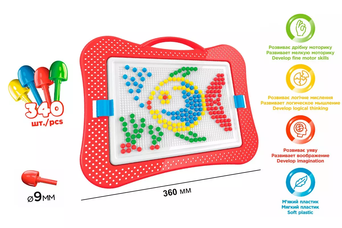 Вага 460 г Габаритні розміри 37.5 ? 29 ? 4 см Мозаїка складається з зручного пенала-саквояжа з двома фіксаторами. Розмір фішки - 9 мм. Чотири кольору - 340 фішок. Іграшка «Мозаїка 4 ТехноК» 3367 покликана прищепити художній смак малюкам, сформувати почуття гармонії кольору правильне сприйняття пропорцій зображення та й просто дозволяє дітям розважитися і з користю провести час. Це реальна альтернатива електронним ігор подібного плану. На відміну від них тут немає побічних ефектів і поганого впливу на здоров'я незміцнілого малюка від різних випромінювань, а результати своєї творчості він може виставити на загальний огляд. Немає залежності від наявності електрики, і нарешті зламати планшет, смартфон або ноутбук набагато простіше ніж представлений набір. Фішки складені в зручний пенал-чемодан з двома фіксаторами. Чотири кольори - 340 фішок. Розмір фішки - 9 мм. Збирати картинки рекомендується починати з прикладів запропонованих на упаковці. Виріб виготовлено з якісного пластику і рекомендовано для дітей від 3-х років.