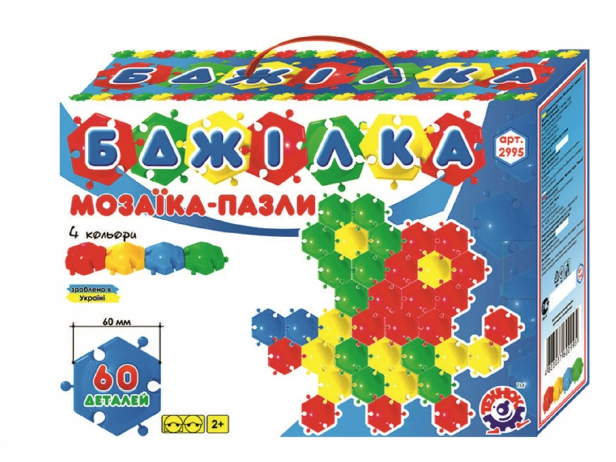 Іграшка зроблена з пластику. Має дрібні деталі. Комплектація: 60 деталей (шестикутних) Мозаїка-пазл «Бджілка» запакована в картонну валізку з ручкою, що робить цей набір дуже зручним у зберіганні і транспортуванні. Розвиваюча настільна гра мозаїка-пазли «Бджілка» є аналогом дитячого конструктора. Сприятливо впливає на правильний та швидкий розвиток творчих задатків, дрібної моторики рук і загальної координації рухів. Безпечна та якісна іграшка дає дитині можливість необмежено використовувати фантазію для створення власних шедеврів. Цікаві кольорові фігури можна складати на столі, підлозі або інший рівній поверхні як самому, так і запросивши друзів, що теж дуже позитивно позначається на розвитку комунікативних навичок у дитини.
