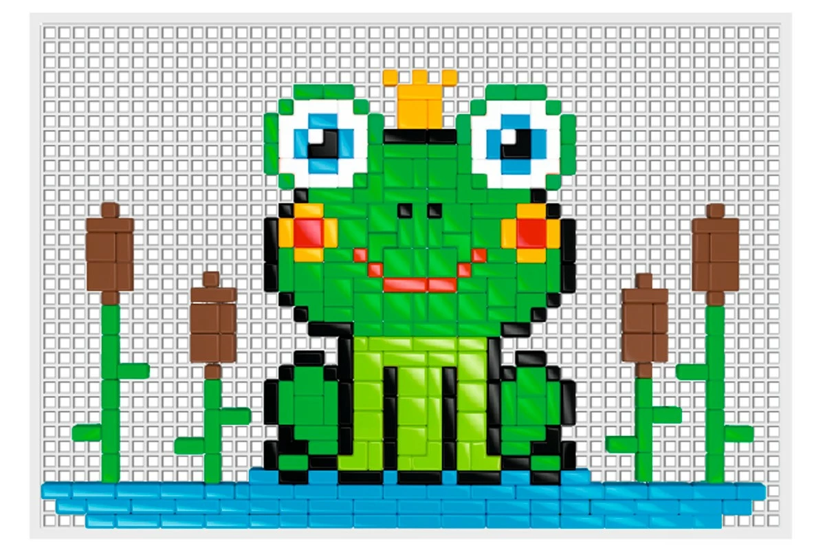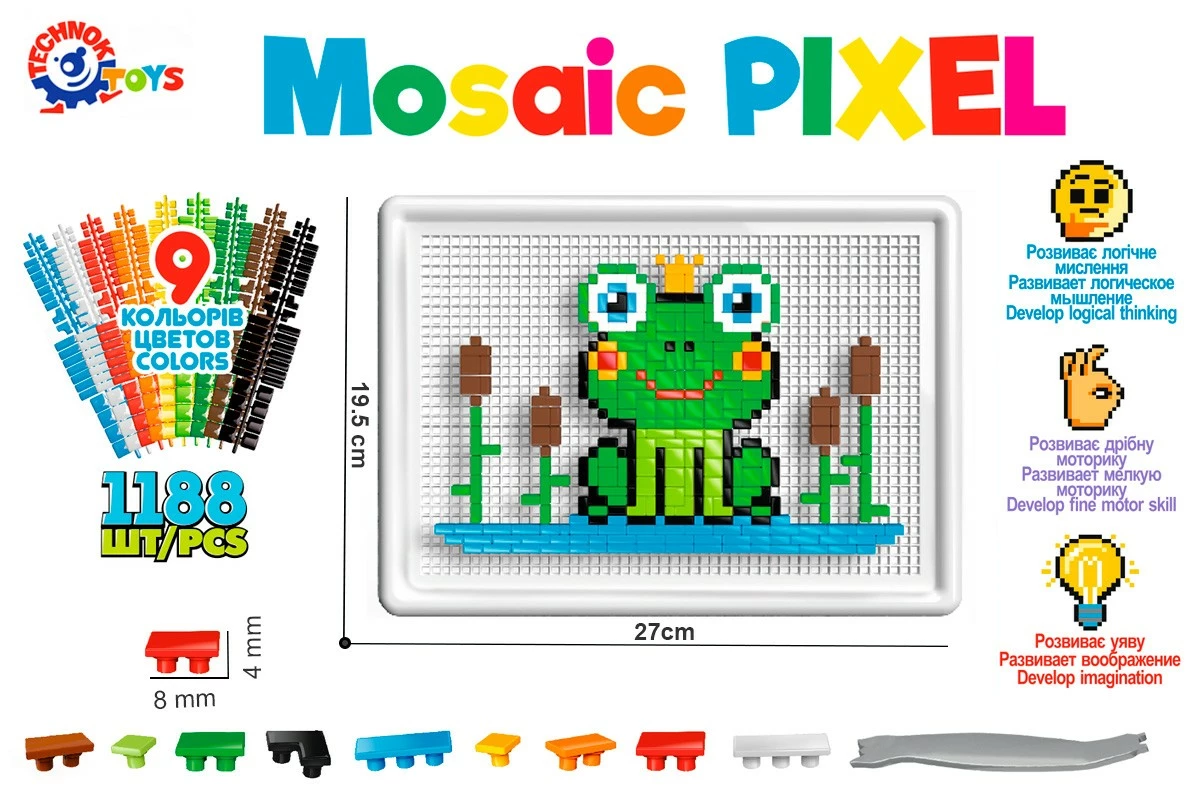 Піксельна мозаїка, як вишивка, малюнок викладається на пластикове поле дрібними фішками різних форм. Всього у комплекті 1188 елементів дев'яти кольорів! Розмір найменшого квадратика 4х4 мм. На допомогу діткам є спеціальний інструмент, яким зручно виймати фішки з поля. Для юних творців у наборі є інструкція, згідно з якою можна зібрати два малюнки: яскраву бджілку та царівну жабку. А далі, складати власні малюнки, що підкаже дитяча фантазія. Іграшка "Мозаїка ТехноК" - це відмінна гра для розвитку дрібної моторики, уваги та пам'яті. Викладаючи картинку, потрібно рахувати кожен наступний крок. Це допоможе дітям покращити навички лічби та концентрацію. Пакування - яскрава коробка, в якій зручно зберігати всі елементи мозаїки. У наборі: пластикове поле, 1188 елементів, інструмент для викладання та інструкція. Для дітей від 5-ти років.