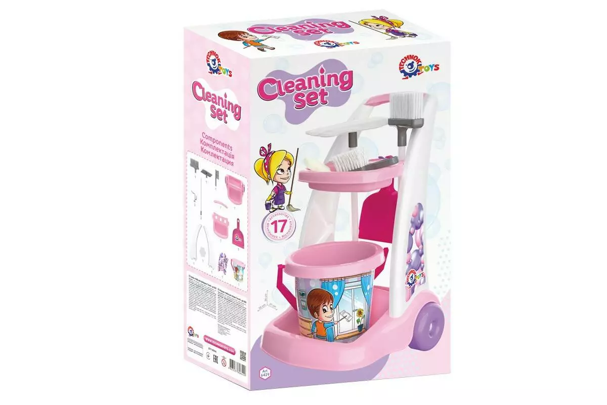 У «Наборі для прибирання ТехноК» є яскраве відерко з барвистою наліпкою, виконаною за допомогою технології IML, швабра, мітла, щіточка та совок. Всі елементи можна розмістити на возику та перевозити з собою. На нижній полиці візка є спеціальне місце для відерка, а на верхній полиці з трьома гачками зручно розмістити дрібні елементи набору. З таким возиком все необхідне завжди буде під рукою. Візком можна користуватися як вдома, так і на ігровій площадці. А як використати візок на вулиці малюк з друзями вирішить сам, адже перевезти на цьому візку можна багато. Іграшковий набір стане улюбленою іграшкою для маленьких помічниць, адже можна все робити «як мама». Прибирати у ляльковій кімнаті або доглядати за хатніми улюбленцями. Такі ігри допомагають розвивати уяву, мислення та пам'ять, знайомлять малюків з різними професіями, вчать охайності.