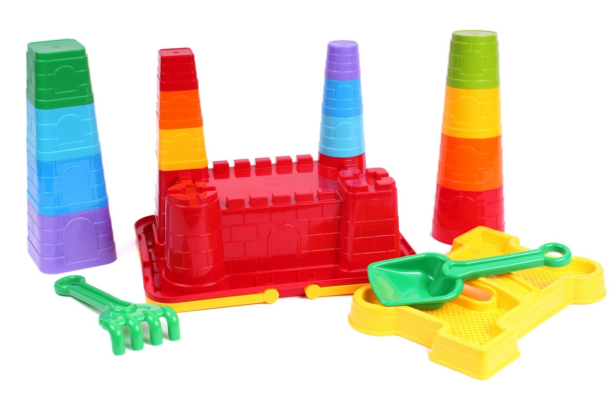 Ігровий набір «Фортеця» прекрасно підходить для активної гри як вдома, так і на вулиці. Він складається з 18 елементів: оригінального червоного відерка, в формі середньовічної фортеці з чотирма вежами; 14-ти класичних пасочок-пірамідок, квадратної і округлої форми, які своєю формою імітують вежі середньовічного замку; кришки-сита в формі рову з мостиком та грабельки і лопатки. Кольори пірамідок підібрані в порядку кольорів природньої веселки. Завдання малюка - правильно підібрати елементи по розміру та формі, щоб збудувати вежі фортеці. А далі – неосяжний простір для дитячої фантазії. Фортеця може захистити чарівну принцесу від підступного дракону або стати на перешкоді злим розбійникам… Розмір товару: висота відерка - 11 см, ширина відерка - 31 см, ширина сита - 18 см, висота сита - 26 см, довжина граблів – 19 см, довжина лопатки – 22 см, розмір пасочок: від 4 до 8 см.