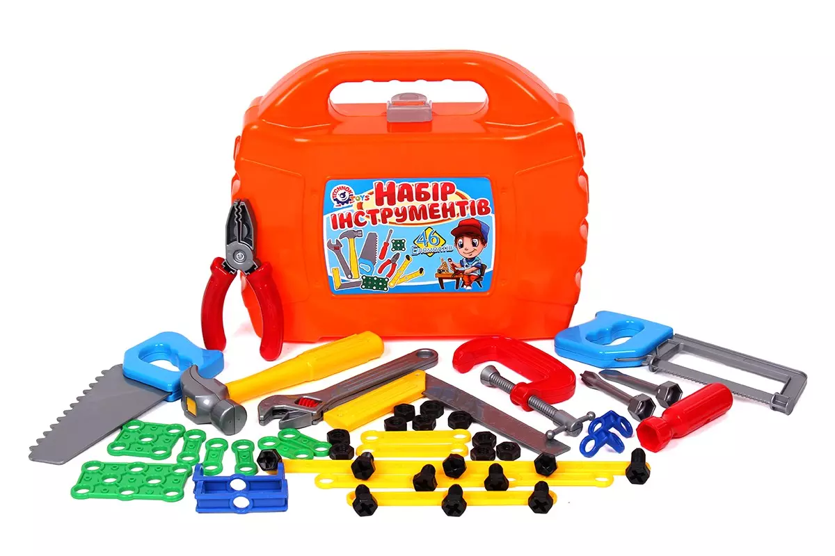 Іграшка доповнює класичний набір інструментів з набору арт. 4371 (молоток, пилочки, викрутки, плоскогубці та ін.) елементами конструктора, а саме: пластикові планки, кутники, пластини, болти та гайки. Це чудова нагода для малюка вивчити принципи роботи різьбових з`єднань, що безумовно стане в нагоді у дорослому житті. В комплекті: плоскогубці, кутник, молоток, пилка по металу, пилка по дереву, струбцина, розвідний ключ, викрутка з двома насадками, болти та гайки по 10 шт., планки - 10 шт., пластини - 10 шт., кутники - 2 шт. та 2-і скоби.
