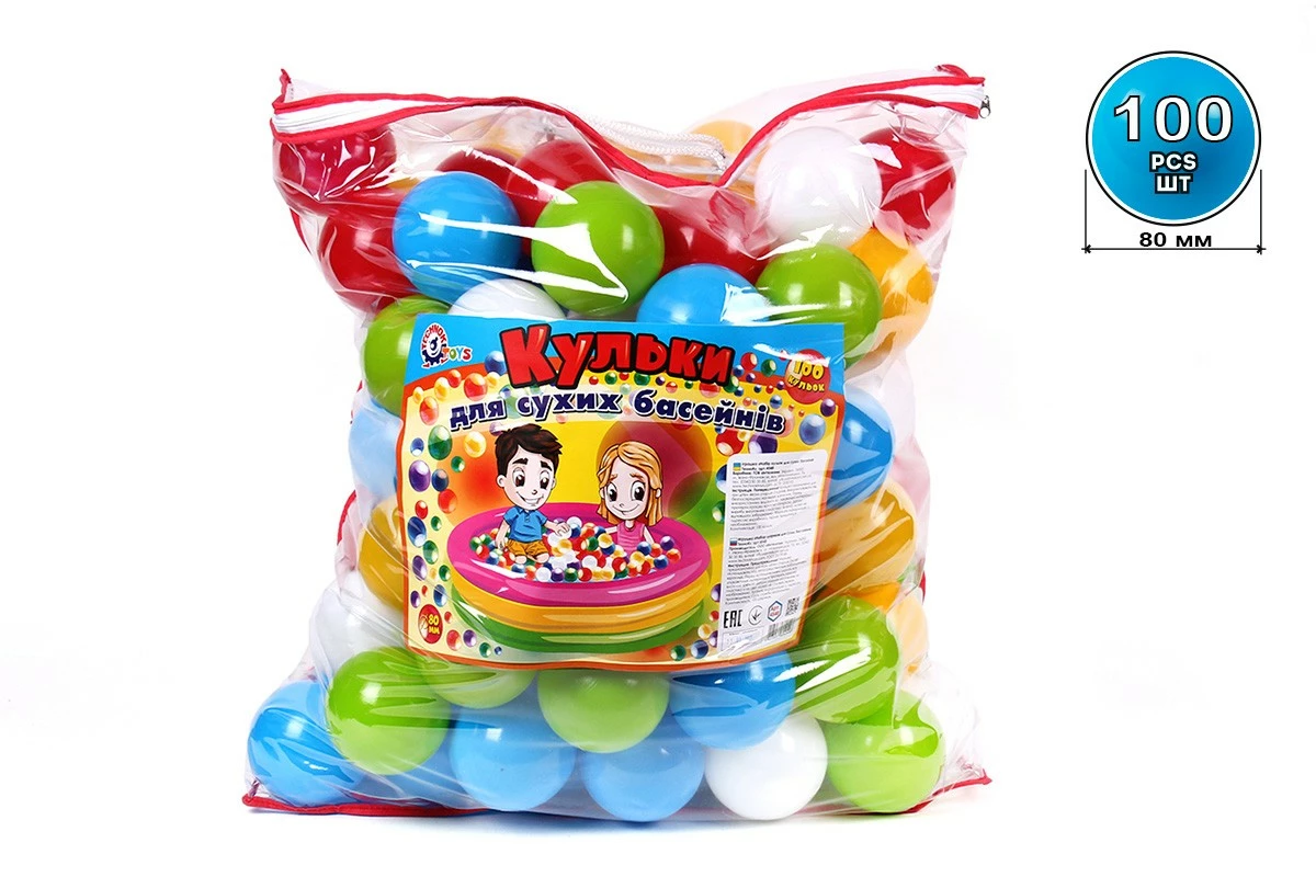 Ігрfшка може використовуватися в сухих басейнах і в інших спортивних іграх у приміщеннях та на вулиці. Це легкі та міцні різнокольорові кульки 5-ти яскравих кольорів розміром 80 мм в кількості 100 штук, які упаковані в зручну сумку-пакет з ручками із застежкою-молнією, виготовленою з міцного прозорого ПВХ. Сумка може бути використана для подальшого зберігання баликів.