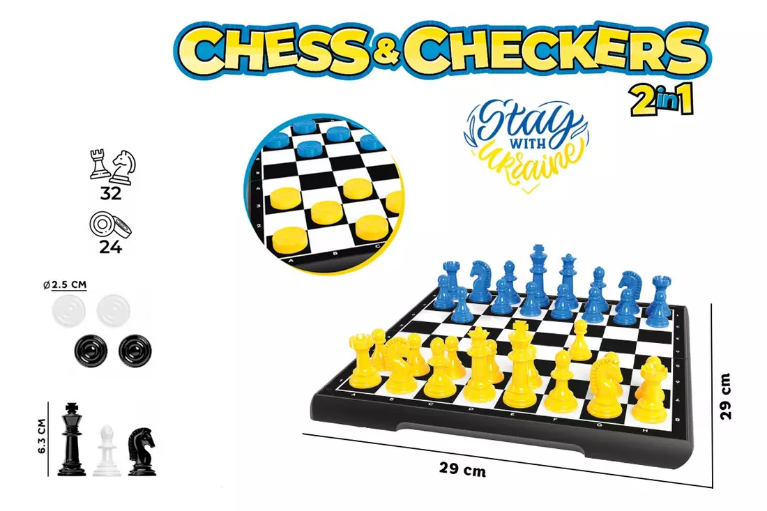 Набір "Шахи та шашки" в патріотичних синьо-жовтих кольорах стануть чудовим подарунком дітям і дорослим. Шахи і шашки – одні з найпопулярніших ігор у світі вже багато століть і овіяні легендами та переказами. Ігри з фішками на дошці з чорними та білими клітинками були відомі ще в 3 - 4-му тисячоліттях до н. е Ці ігри поєднують у собі холодний логічний розрахунок з мистецтвом уяви, підкріплені спортивним азартом. Поціновувачами шіхів було немало геніїв людства. Шахи вважали своєю улюбленою грою Отто фон Бісмарк, Чаплін та Альберт Енштейн, захоплюється цією грою Мадонна, Кріштіан Рональду, Марк Цукерберг та навіть Білл Гейтс. Серед вітчизняних селебретіс люблять провести час за шахівницею брати Клички та Святослав Вакарчук. І це зрозуміло, адже ігри розвивають стратегічне та логічне мислення, пам'ять, уяву та логіку, є чудовими психологічними тренінгами - потрібно постійно розгадувати наміри супротивника, самому зберігаючи при цьому спокій. зосередженість та холодну голову. І ще - ці настільні ігри не мають обмеження у віці, можна грати усім від 5-ти до 99 років, і старшим). "Набір настільних ігор" від ТехноК – чудовий вибір для всієї родини. Це привід зібратися разом та корисно провести час. Можна влаштувати турнір з шахів або шашок серед друзів та рідні. Ба навіть у майбутньому стати професійним спортсменом, адже хоча шахи та шашки тільки "намагаються" стати олімпійськими видами спорту, призовий фонд на різних чемпіонатах вже досягнув 2-х мільйонів доларів. У наборі шахи та шашки у великій пластиковій коробці, що закривається на міцну защіпку. Так іграшку зручно зберігати та не загубити фігури. Шахівниця з металевої пластини гладка та блискуча. Розмір шахової дошки 28*28 см. Фігури великі та зручні, класичного дизайну. Висото фігури "король" 65 мм, "пішак" 35 мм. Шашки - діаметр 25 мм. Шахи та шашки сприяють розвитку концентрації уваги, вміння долати труднощі та планувати свої дії, логічно мислити. Вік: від 5 років. Матеріал: пластик, метал. Комплектація: пластикова коробка з металевим полем, шахи – 32 фігури, шашки – 24 шт.