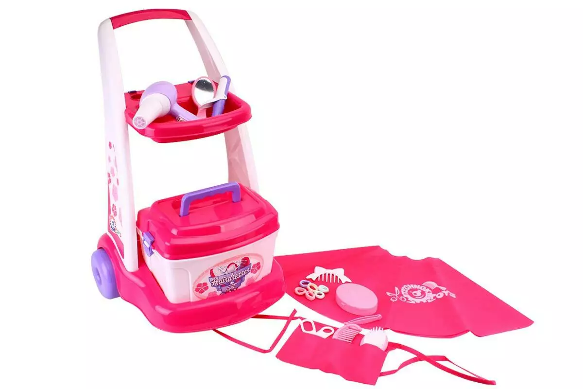 Власний професійний салон краси - мрія кожної дівчинки. Відкрити такий маленьким модницям допоможе "Набір перукаря ТехноК" з містким саквояжем та маневровим візком. У салоні можна зробити зачіску подружкам та матусі, накрутити волосся лялькам та, просто, припудрити носик. У наборі є різноманітні професійні інструменти на аксесуари. Для майстра-перукаря - пояс з кишеньками, щоб всі інструменти були під рукою. Не забруднити одяг клієнта допоможе спеціальна накидка на защіпці. У комплекті також є гребінець, щітка, плойка та шпилька у формі бантика для модної кучерявої зачіски. Дзеркальце з ручкою, пінцет та пудрениця будуть завжди під рукою для ідеального макіяжу. А щоб гарно просушити волосся та зробити легку укладку варто використати електричний фен. Фен працює від 1 батарейки, типу АА, має характерний звук та дує легеньким вітерцем, як справжній фен. Тепер у маленької модниці все буде все як справжній перукарні. Для ідеальної святкової зачіски у пригоді стануть 6 резинок для волосся та схема заплітання косичок. Такий набір принесе море радості маленьким модницям та зробить ігри дуже реалістичними. Розміри іграшкового приладдя оптимально розраховані для дитячих ручок. Також їх зручно взяти з собою на прогулянку чи у садок. Зберігати та переносити перукарські інструменти та аксесуари можна у місткому саквояжі на защіпках та на візочку. На нижній полиці візка є спеціальне місце для саквояжа, а на верхній полиці з трьома гачками розмістити дрібні елементи набору. Візок зручний та маневровий, добре їздить на різних поверхнях, стійкий до перекидань. З набором перукаря від ТехноК кожна дівчинка відчує себе справжній профі перукарської справи! Сюжетно-рольові ігри розвивають дитячу уяву, фантазію, мислення та дрібну моторику. Знайомлять дітей з основами гігієни та щоденно догляду. Такі ігри покращують комунікативні та соціальні навички. Іграшка виготовлена з міцного якісного пластику, без запаху. Комплектація: візок, саквояж, фен, плойка, гребінець, щітка, дзеркальце, 2 заколки гребінець, пудрениця, пінцет, ножиці, накидка, пояс, 6 резинок для волосся, інструкція для заплітання. Для дітей від 3-х років. Пакування – яскрава коробка 61,8х37,5х20 см