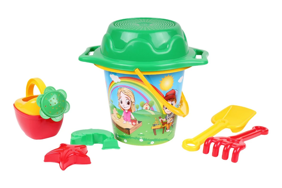 Вага 350 г Розміри 25 ? 25 ? 24 см У набір для гри в піску входять: відро, сито, формочки, лопатка, грабельки і лієчка. Ігри в піску та біля води зроблять час, проведений у пісочниці, незабутнім та збагатять дитинство Вашого малюка. Ігри стануть цікавішими із цим чудовим відерком з малюнком, який привертає увагу малюків. Малюнок виконаний за технологією IML. Ця унікальна технологія забезпечує стійкість малюнку до вигоряння на сонці та стирання. Малюнок неможливо відклеїти.