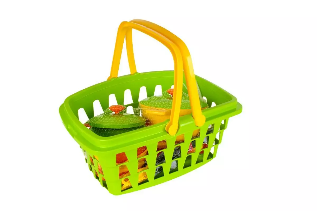 Кухонний набір у місткій корзині – справжня знахідка для маленької господині. Яскраві кольори та різноманіття посуду неодмінно привернуть увагу малечі та батьків. У наборі є все необхідне для приготування смачних страв та зустрічі гостей. Великі каструлі з кришками, сотейник з кришкою та сковорідка для втілення різноманітних кулінарних задумів. Шумівка, черпак та лопатка зроблять процес приготування максимально реалістичним. Всі іграшки розміщуються у великій корзині з двома ручками. Так посуд можна брати з собою на прогулянку і влаштувати справжній пікнік для друзів. Вдома ж іграшки зручно зібрати у кошичок та зберігати у дитячій кімнаті. Кухонний набір у кошичку стане улюбленою іграшкою маленької господині. Він чудово доповнить ігрову кухню Вашої малечі. Господиньки з радістю готуватимуть смачні борщі, соковиті стейки та інші кулінарні шедеври. Такі сюжетно-рольові ігри допоможуть Вашим діткам проявити гостинність, привчать дотримуватись порядку та бути акуратними. З іграшковим посудом діти вивчають основи сервірування столу та кулінарії. Ігри розвивають координацію, уяву та мислення. Увага, іграшка тільки для дітей. Ми переживаємо, що батьки теж високо оцінять розміри та зручність корзини та швидко знайдуть їй застосування у господарстві. Корзину зручно брати на прогулянку у парк чи за грибочками у ліс. Всі елементи набору виготовлені з міцного якісного пластику без запаху, безпечні для дітей. У наборі: корзина, 2 каструлі з кришками, сотейник з кришкою, сковорідка, лопатка, велика виделка, черпак, шумівка, кавник з кришкою, 4 тарілки з приборами.