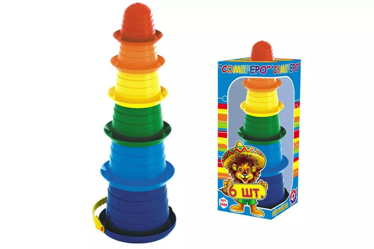Вага 175 г Габаритні розміри: 35 ? 12.5 ? 12 см. Для гри малюкам від 3 місяців. Дитяча пірамідка «Сомбреро 2 ТехноК» 2698 складається з 6 яскравих елементів. Малюк складає пірамідку або вкладає елементи один в одного. За допомогою цих форм можна робити різні фігурки в піску. Пірамідка один з найпростіших і не витратних способів справити позитивний вплив на розвиток малюка. Практичне усвідомлення понять розміру, кольору, об'єму, все це допомагає засвоїти звичайна пірамідка. Іграшка виготовлена з харчового пластику, не має гострих кромок і абсолютно безпечна для дітей будь-якого віку.