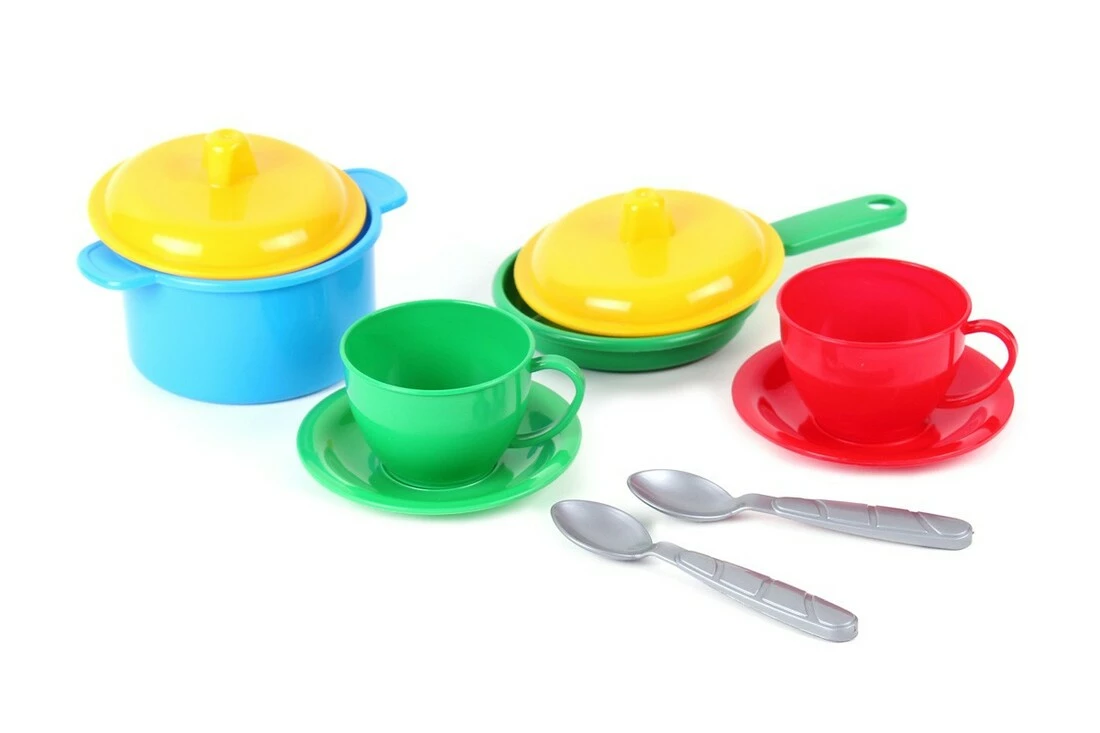 Набір для чаювання «Маринка» допоможе Вашій маленькій господині відчути себе на місці мами і стати більш відповідальною. Чотири чашки, блюдця і ложечок дарують чудову можливість запросити в гості своїх подружок на посиденьки. А ще можна посадити разом всіх ляльок і плюшевих зайчиків за стоїк і влаштувати чаювання. Так дівчинка обов'язково захоче в майбутньому допомагати мамі на цій кухні і разом готувати смачну їжу для всієї родини. Великі предмети набору дозволяють подарувати іграшкову посуд навіть найменшим дітям. Сюжетно-рольові ігри розвивають дрібну моторику, образне мислення і розширюють кругозір. Характеристики Іграшка зроблена з високоякісної міцної пластмаси. Комплектація 4 чашки, 4 ложки, 4 блюдця, 1 каструля.