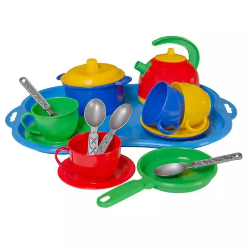 Вага 250 г Габаритні розміри 32?23?11 см Комплект складається з 4-х чашок, тарілок та ложок, чайника, сковорідки, каструлі та підносу. Посуд - чудова іграшка для майбутніх господинь. З посудом Маринка Ваше малятко відчує себе в ролі справжньої господині і зможе накрити стіл для своїх ляльок. У комплекті є прилади для готування, їжі і чаювання. Вони виготовлені з міцних матеріалів, що відповідають всім стандартам якості і безпеки. Сюжетно-рольові ігри з набором сприяють розвитку дитячої уяви, мислення і фантазії.