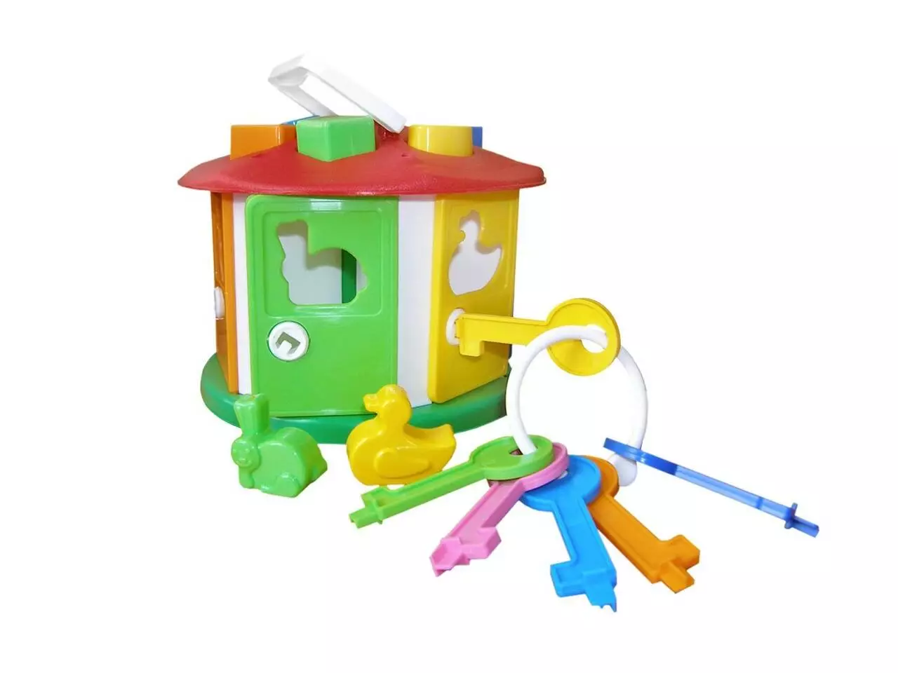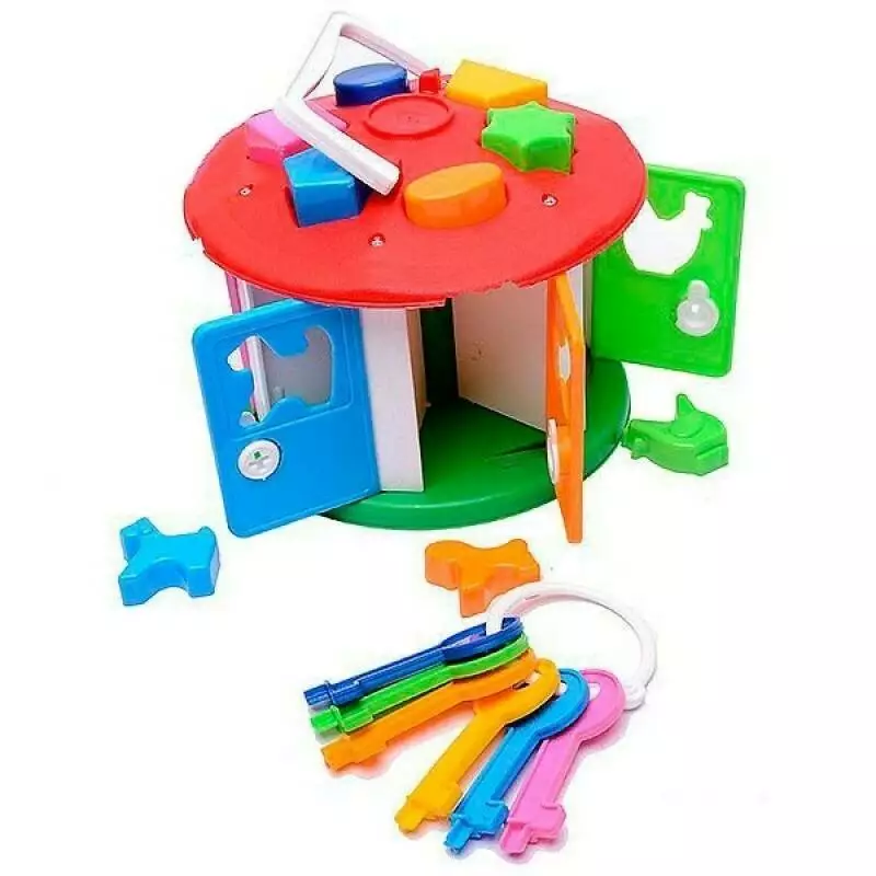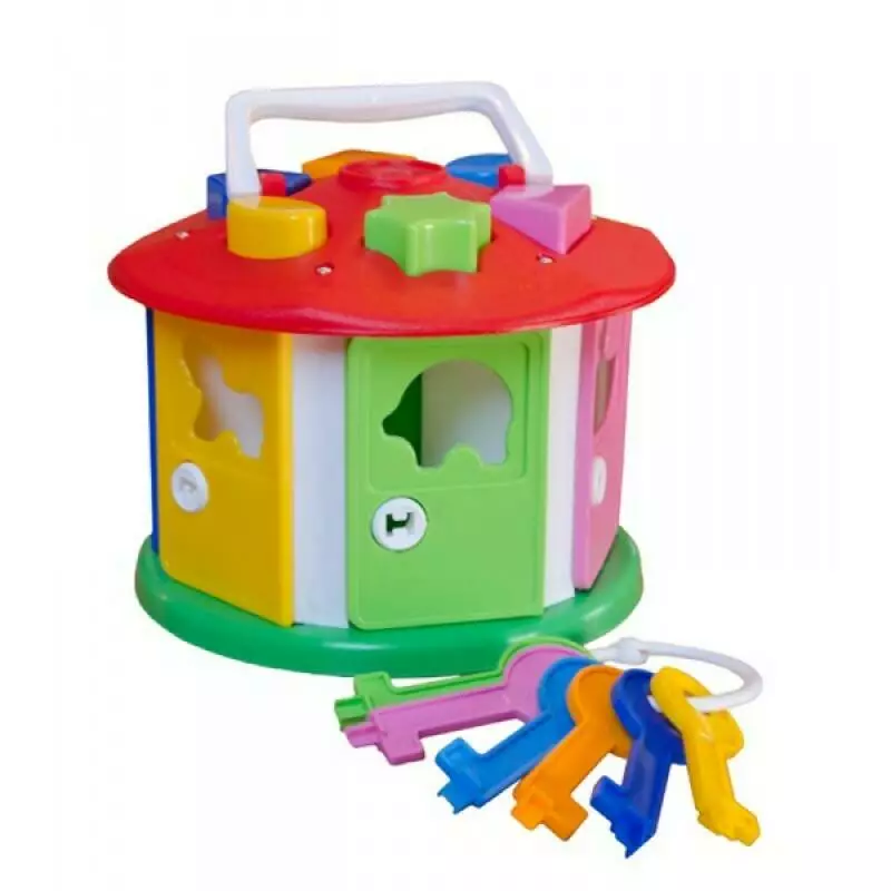 Вага: 425 г Габаритні розміри: 19?19?16.5 см Комплектація: 1 будиночок, 6 геометричних фігурок, 6 фігурок тварин, 6 ключів. Іграшки для маленьких дітей повинні бути не тільки яскравими і цікавими, щоб захопити Вашу дитину, але і розвиваючими, щоб карапуз ріс розумним і тямущим. Перед Вами знаходиться іграшка-сортер «Будинок». Порожні «віконця» сортера пропонують Вашій дитині підібрати з декількох пропонованих потрібну фігурку і вставити її у відповідний отвір. Кожен ключик підходить тільки до своїх дверей, тому малюк буде розвивати кмітливість і логічні навички. Фігурки допоможуть дитині розібратися з кольорами і формами, поліпшить дрібну моторику і координацію рухів.