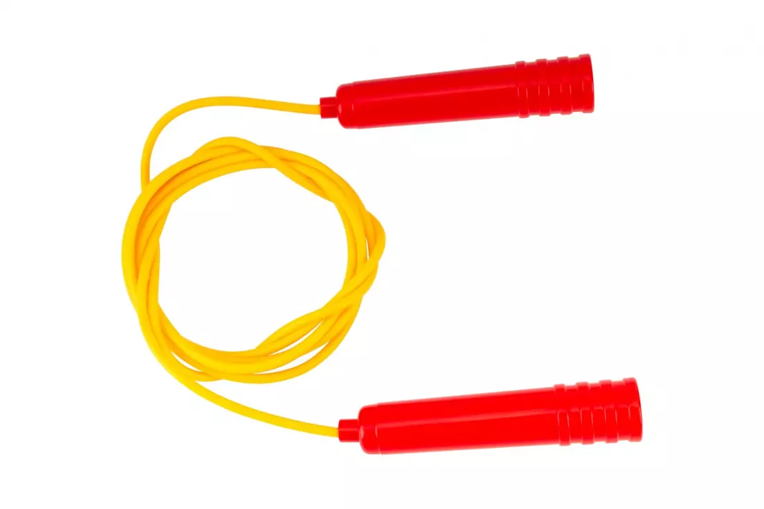 Скакалка - простий та доступний спортивний тренажер для дітей та дорослих. Стрибати на ній можна вдома, у спортзалі та на свіжому повітрі. Заняття зі скакалкою розвивають витривалість, координацію та спритність. Вправи зміцнюють серцево-судинну та дихальну систему, тренують м'язи ніг та ще десяток великих та дрібних м'язів. Всередині ручки спеціально розроблена пластикова втулка. Завдяки їй джгут добре прокручується, не заплутується. Крім спортивних вправ, скакалка підходить для різноманітних рухливих ігор з друзями. Кольоровий джгут. Довжина скакалки 2,2 м. Ручки пластикові, різних кольорів.