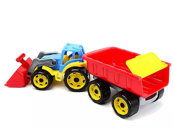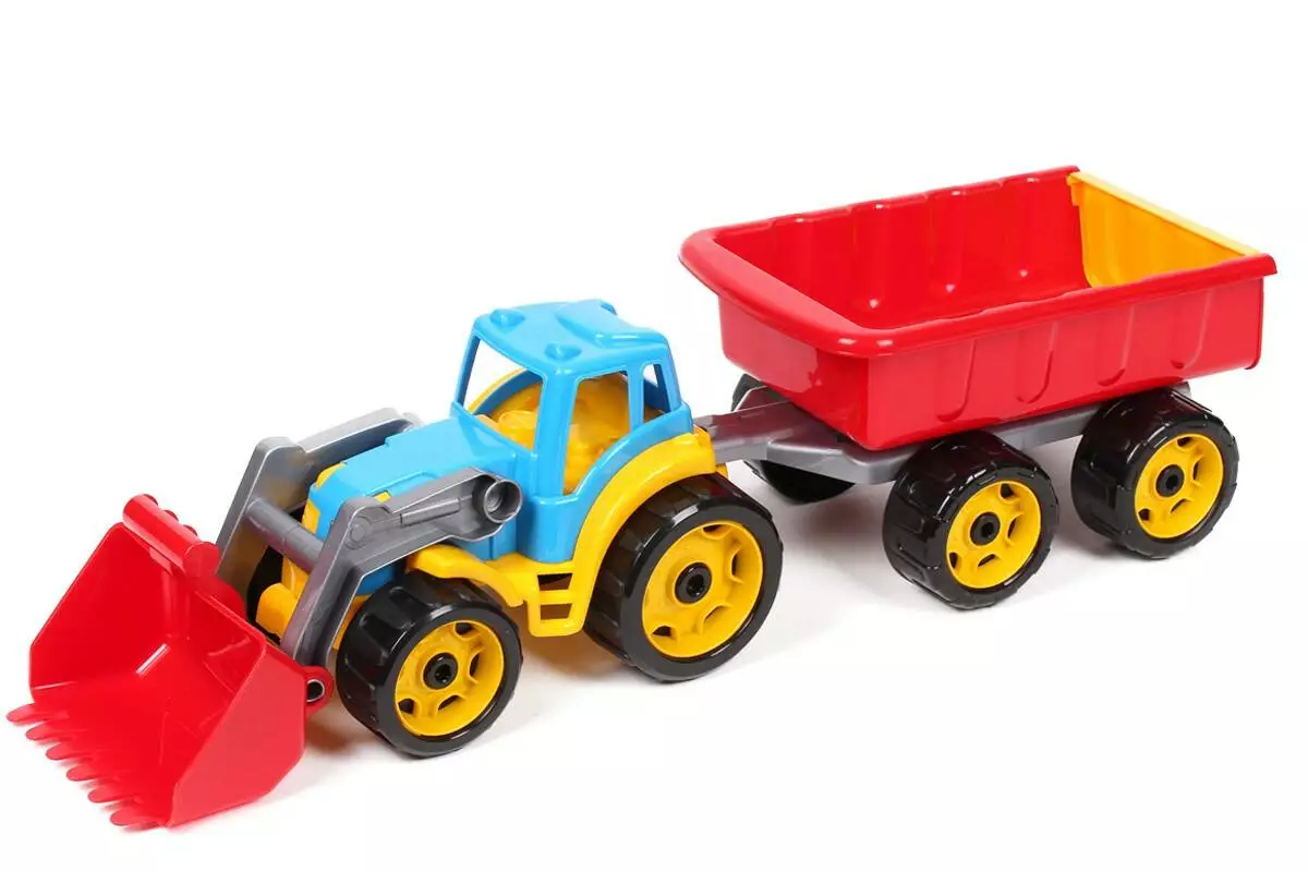 Яскравий пластиковий трактор з ковшом спереду і причепом ззаду. Ківш на тракторі опускається і підіймається дуже легко і має декілька фіксованих положень. Цим ковшем дуже зручно завантажуватиме вантаж в причіп. Також трактор має великі і міцні всюдихідні колеса, щоб з легкістю розтинати на будівництві або в пісочниці.