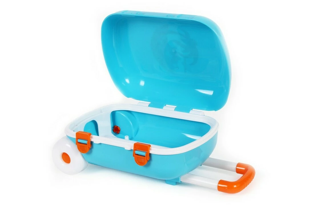 Іграшкова валіза «ТехноК» — цікава, функціональна та дуже схожа на справжню «дорослу» валізу. Виготовлена із міцного і якісного пластику. Яскравий блакитний колір валізи та оригінальна наліпка неодмінно привернуть увагу малюка до іграшки. Валіза комфортна для дітей різного віку та зросту завдяки ручці, що регулюється.Відкрита кришкавалізи фіксується у кількох положеннях. Тому дитина зможе легко складати та виймати речі з неї. А надійні защіпки дозволяють закривати кришку і зберігати іграшки всередині валізи. Крім того великі, міцні колеса допомагають дитині вільно перевозити валізу. З іграшкою «Валіза ТехноК» дівчатка та хлопчики спланують свої захопливі мандрівки та використають її в інших цікавих іграх.