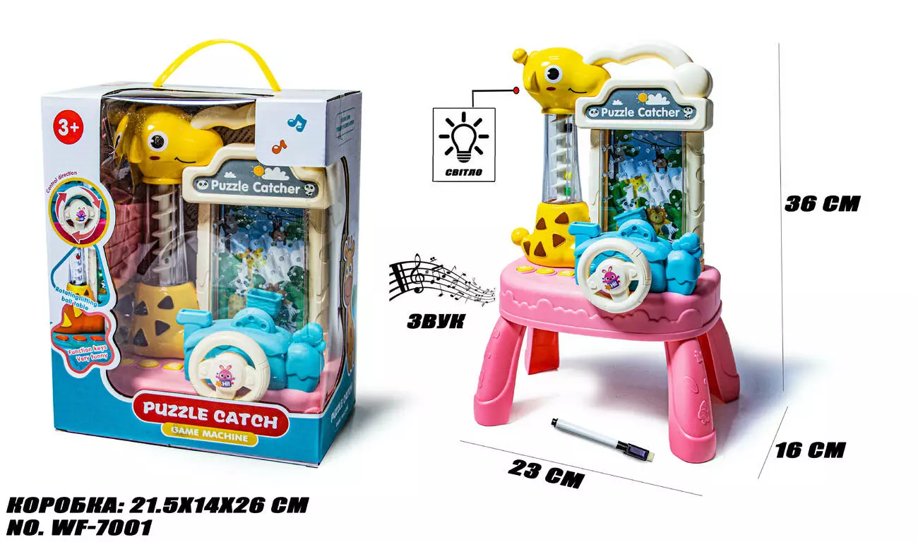 <p><em><strong>Игровая Машина Puzzle Catch WF-7001</strong></em></p><br /> <p>Сыграй в веселую динамичную игру! Животные обожают конфеты, и для хорошего настроения им просто необходимо подкрепиться вкусностями.<br /><br /> С помощью руля ребенок сможет двигать фигуркой и пытаться поймать как можно больше цветных шариков, которые будут падать сверху.<br /><br /> Для тех, кто достигнет мастерства в этом деле, есть возможность усложнить задачу, ускорив движение цветных "конфет".<br /><br /> Особенности:</p><br /> <ul><br /> <li> яркая подсветка;</li><br /> <li> автоматический винтовой подъемник;</li><br /> <li> звуковые эффекты ;</li><br /> <li> в наборе представлены цветные шарики;</li><br /> <li> съемные ножки;</li><br /> <li> набор дополнен декоративными наклейками;</li><br /> <li> работает от 3-х батареек "АА" (в комплект не входят).</li><br /> </ul><br />