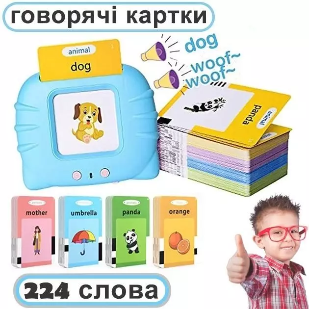 Ще ніколи не було так легко та цікаво вивчати базові англійські слова з вашими дітьми. Інтерактивна іграшка ідеальна для навчання з сім'єю, ігровий набір з картками може не лише розпізнавати речі, а й вивчати слова та їхню вимову. ОСОБЛИВОСТІ: Іграшка, що розвиває, включає 112 двосторонніх карток із зображенням 224 слів англійською мовою, які при вставленні в пристрій озвучуються англійською мовою (карти охоплюють 12 тем: персони – 8 шт.; кольори – 9 шт.; форми – 6 шт.; тварини – 56 шт.). їжа - 21 шт.; фрукти - 18 шт.; овочі – 17 шт.; предмети – 31 прим.; одяг - 16 шт.; природа – 10 прим.; професії – 8 шт.; транспортні засоби – 25 шт.; Картки зі звучанням розроблені вчителями англійської мови та підібрані для базового вивчення дітками; Іграшка також містить реалістичні звуки симуляції тварин та автомобілів, які добре надихають дітей на фонологічні здібності, а також барвисті ілюстрації та смішні звуки можуть привернути увагу дітей та зацікавити їх до навчання; Простий у використанні: малюкам легко користуватися освітніми картами самостійно, просто вставляючи картку у пристрій для зчитування; Слова можна відтворювати знову, натиснувши відповідну кнопку, а також можна регулювати гучність (5 рівнів гучності); можна відтворювати неодноразово та регулювати гучність; Іграшка працює від вбудованого ємного акумулятора, одного заряду якого вистачає на 4-5 годин. занять залежно від обраного рівня гучності; Прекрасний пристрій для спільної гри. Грайте з дітьми, щоб чудово провести час сім'єю; Прекрасна логопедична іграшка для дітей 2-8 років; Є окрема маленька упаковка для карток, щоби останні не губилися поряд з іншими іграшками; Ідеальний подарунок для дітей віком 2-8 років. Якщо ви шукаєте веселий та навчальний подарунок для своїх дітей, то ці навчальні картки для малюків – найкращий вибір. Ідеальний подарунок для свят. Комплектація: будову (машинка для зчитування слів на картках); 112 карток із 224 словами; USB-кабель для заряджання; картонна упаковка загальна; картонна упаковка окрема для карток; Іграшки для логопедії та аутизму: іграшка для навчання з картами може взаємодіяти з дітьми, відмінний інструмент для самонавчання та навчальні матеріали для дітей. Це найкращі логопедичні іграшки для дітей 2-8 років. Характеристики: Розміри упаковки загальної: 18 х 9,8 х 4,2 см Розмір іграшки: 10,7 х 9 х 2,1 см Живлення: USB кабель Місткість батареї: 300 mah Країна виробник: Китай Колір блакитний Матеріал: пластик Особливості Чи здатні говорити Навчальні Дітям 2-8 років.