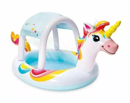 Дитячий басейн “Unicorn Spray Pool” Intex 58435 – новинка 2022 року з надувним навісом, який закриє Вашого малюка від сонця у спекотний літній день. Додаткове прохолоду додасть невеликий фонтанчик, який працює від підключеного садового шланга. Толщина матеріалу: 0,30 мм. Є зливний клапан. • Для дітей віком від 2 років • Розмір 254х132х109см • Матеріал: вініл товщиною 0.30мм • Яскраві кольори • Фонтан працює від садового шланга • Об'єм води (18 см): 130 л • Зливний клапан • Комплект для ремонту