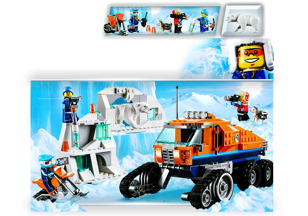 360 деталей вік 6 + матеріал-пластик Вирушай у захопливу експедицію по Арктиці. Тобі знадобиться вантажівка для дослідження місцевості, пристосувань для пересування по льоду. Не забувай встановлювати обладнання, створене спеціально для дослідження льодяного покрову. Візьми снігохід, щоб швидко та комфортно досліджувати територію. Усі інтересні матеріали, знайдені у кризі, візьми із собою до лабораторії. Ретельно оглянь крижану стіну і знайди вхід до печери. Будь обережним, щоб білий ведмідь не пообідав тобою.