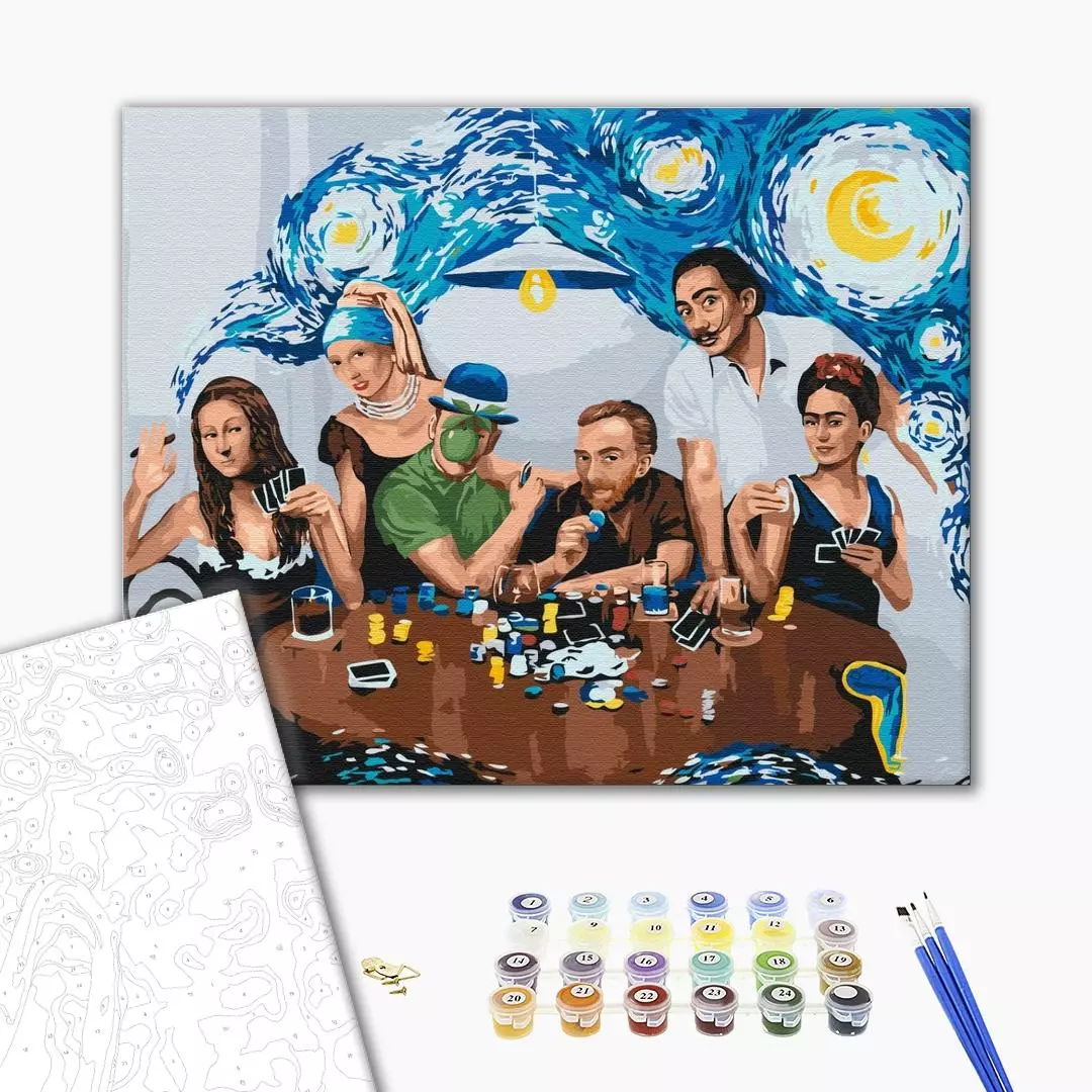 У набір входить: бавовняне полотно на дерев'яному підрамнику з нанесеною пронумерованій схемою майбутньої картини 3 кисті різної товщини акрилові пронумеровані фарби кріплення до стіни для готової картини