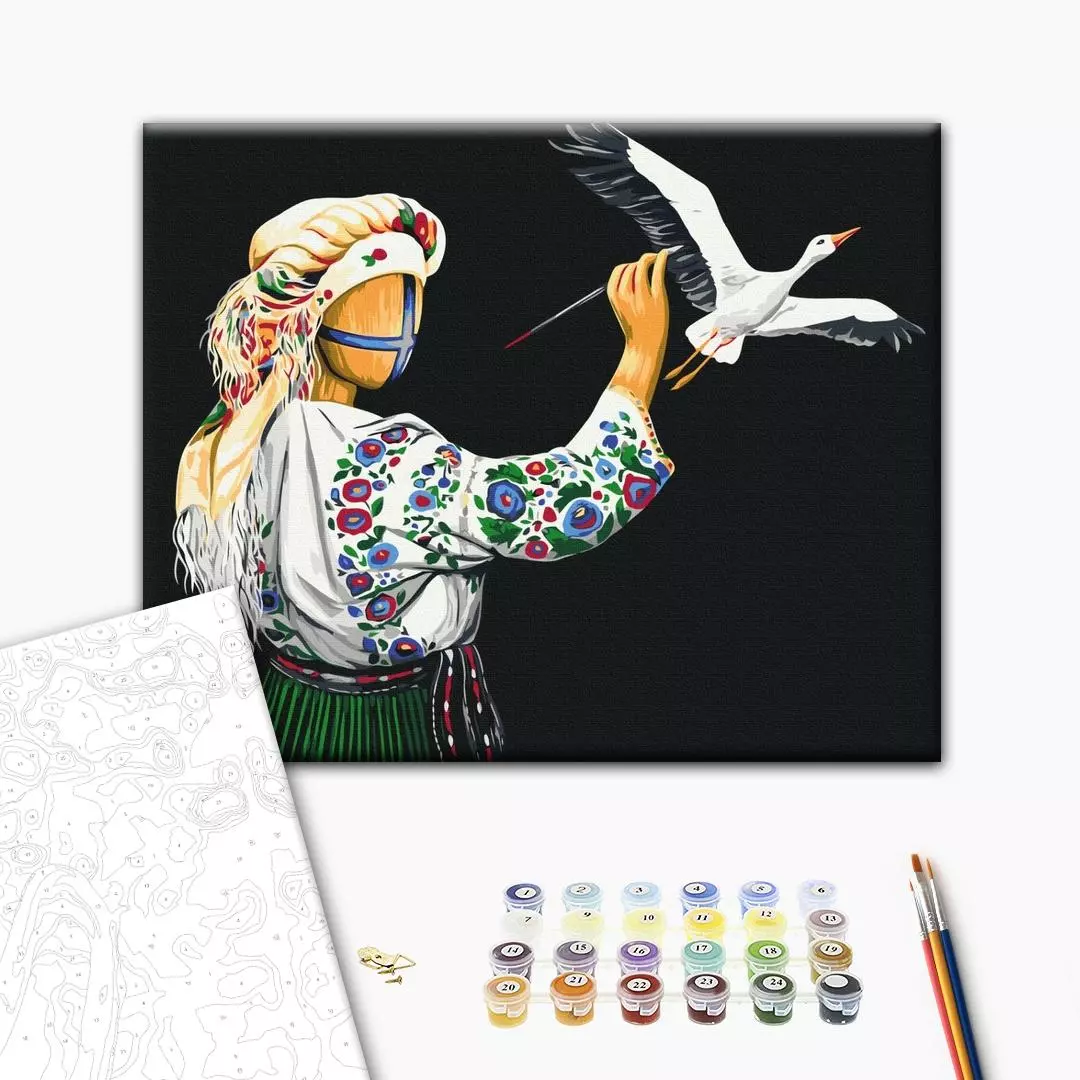 У набір входить: бавовняне полотно на дерев'яному підрамнику з нанесеною пронумерованій схемою майбутньої картини 3 кисті різної товщини акрилові пронумеровані фарби кріплення до стіни для готової картини