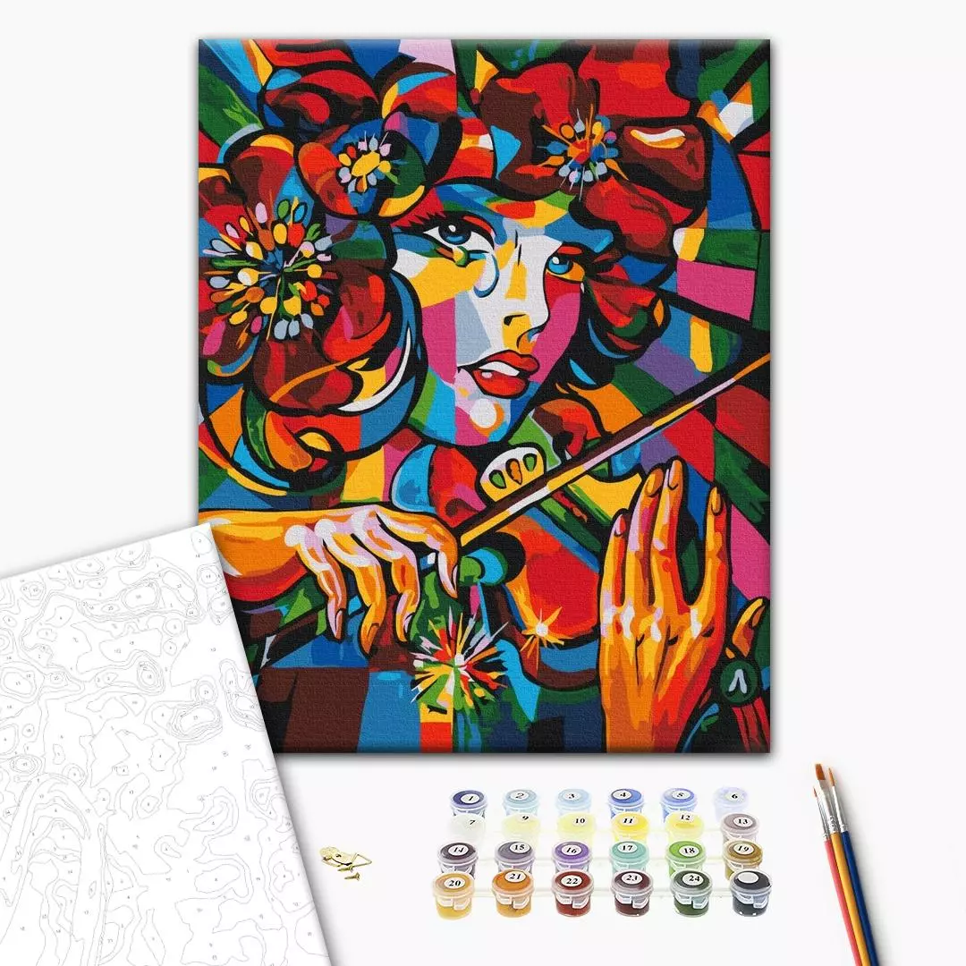 У набір входить: бавовняне полотно на дерев'яному підрамнику з нанесеною пронумерованій схемою майбутньої картини 3 кисті різної товщини акрилові пронумеровані фарби кріплення до стіни для готової картини
