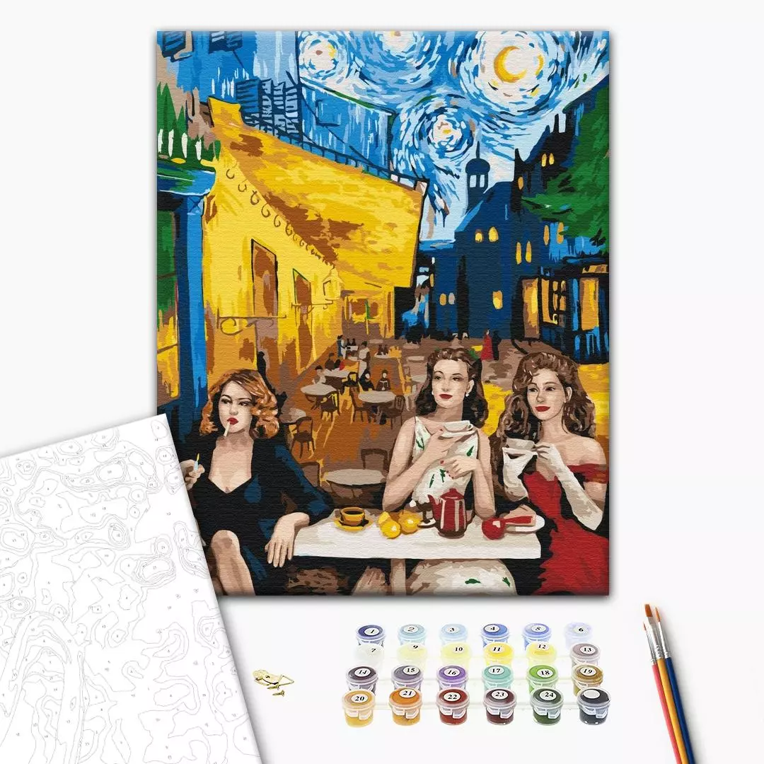 У набір входить: бавовняне полотно на дерев'яному підрамнику з нанесеною пронумерованій схемою майбутньої картини 3 кисті різної товщини акрилові пронумеровані фарби кріплення до стіни для готової картини