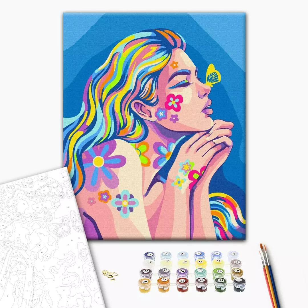 У набір входить: бавовняне полотно на дерев'яному підрамнику з нанесеною пронумерованій схемою майбутньої картини 3 кисті різної товщини акрилові пронумеровані фарби кріплення до стіни для готової картини