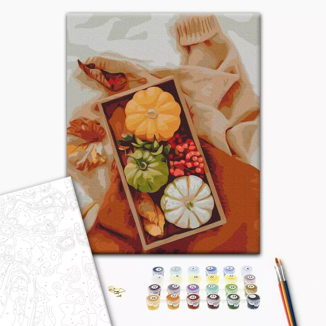 У набір входить: бавовняне полотно на дерев'яному підрамнику з нанесеною пронумерованій схемою майбутньої картини 3 кисті різної товщини акрилові пронумеровані фарби кріплення до стіни для готової картини