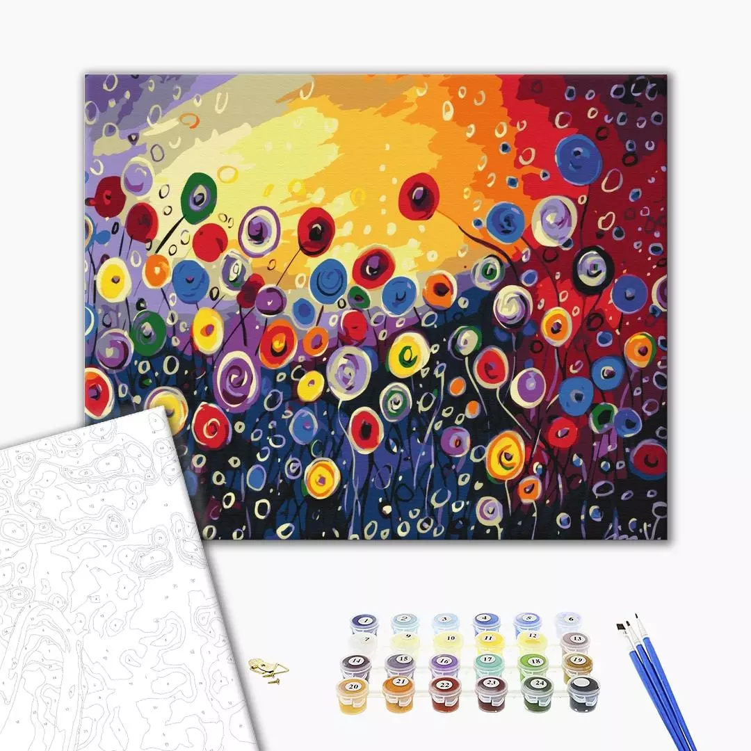 У набір входить: бавовняне полотно на дерев'яному підрамнику з нанесеною пронумерованій схемою майбутньої картини 3 кисті різної товщини акрилові пронумеровані фарби кріплення до стіни для готової картини
