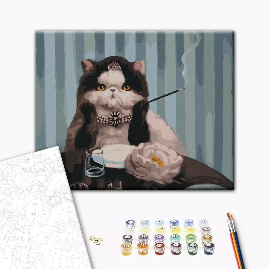 У набір входить: бавовняне полотно на дерев'яному підрамнику з нанесеною пронумерованій схемою майбутньої картини 3 кисті різної товщини акрилові пронумеровані фарби кріплення до стіни для готової картини