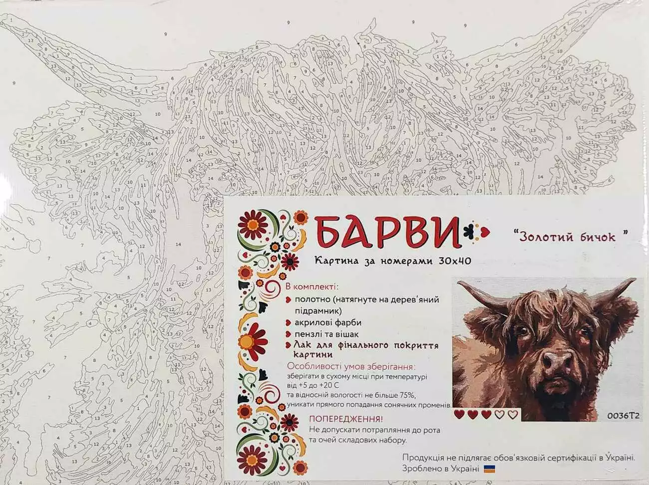 Відчуй себе справжнім художником! Використовуй розпис по номерам і твори шедеври! Дана картина добре прикрасить будь-який інтер'єр і подарує кожному твоєму гостю відчуття перебування вдома у справжнього генія! Увага! Кольори і чіткість картини можуть відрізнятися. Комплектація Набору для малювання: - натягнутий на дерев'яну рамку прогрунтоване полотно, з нанесеними і пронумерованими контурами квітів малюнка. Полотно і весь набір запаяний в стрейч плівку; - настінні кріплення 2 шт. і саморізи; - пронумеровані акрилові фарби в щільно закритих контейнерах (від 14 до 36 кольорів); - кисті (від 3 до 4 шт).