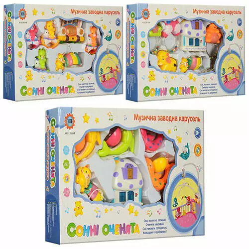 Карусель М 1176 U/R на ліжечко, підвіски 5 шт., 3 види, муз., бат., кор., 46-26-5,5 см.