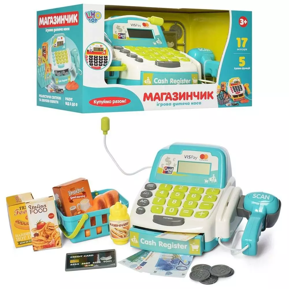 Касовий апарат M 4391 мікрофон, калькулятор, сканер, продукти, муз., світло, бат., кор.,34,5-18-18см