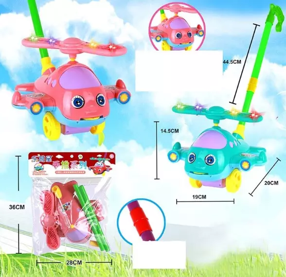 Каталка 198-23 А (72) “Вертоліт”, 2 кольори, на батарейках, підсвічування лопастей, на палиці, з дзвінком, витягує язичок, у кульку