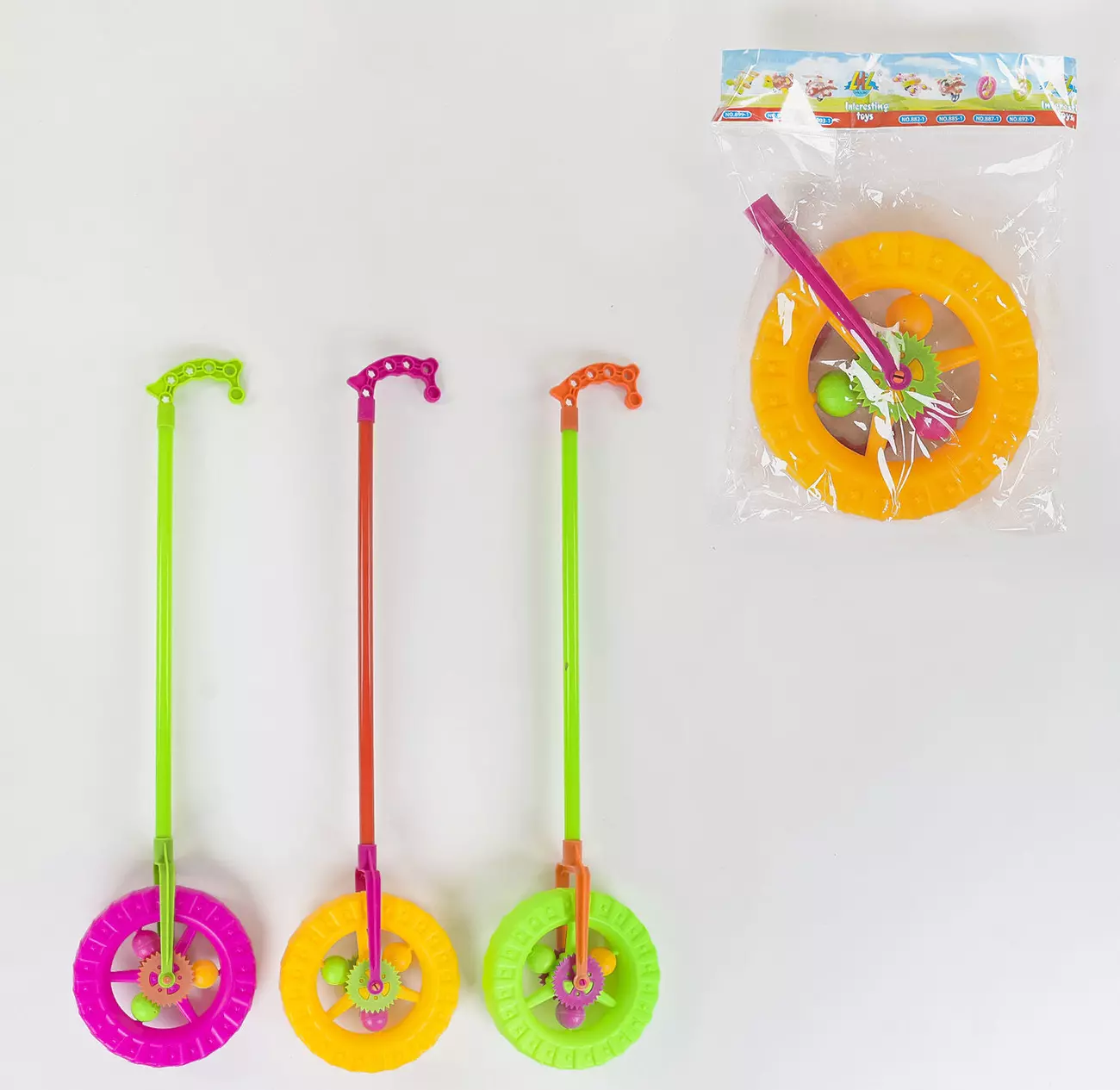 Каталка 909-1 "Колесо", 3 види, з тріскачкою і брязкальцем на паличці, 3 кольори, в пакеті, 60см