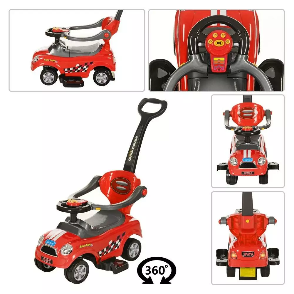 Каталка-толокар Z 321-3 ручка, підст. для ніг, оберт. перед колес 360,муз.,червоно-сірий,63-30-32см.