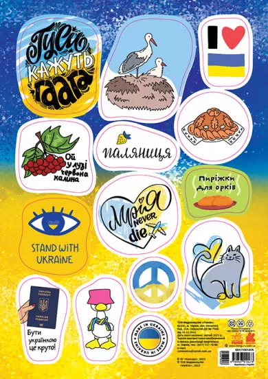 Серія наліпкок патріотичного змісту стане у пригоді дітям та дорослим, які хочуть особисто продемонструвати своє ставлення до сучасних подій, виразити любов до Батьківщини, гордість за свою країну та вдячність і повагу воїнам, які її захищають. Вага: 0.01 Формат, мм: 148х210 Кількість сторінок: 2 Рік видання: 2023 Мова видання: Українська Вік: 6-14 Ілюстрації: Кольорові