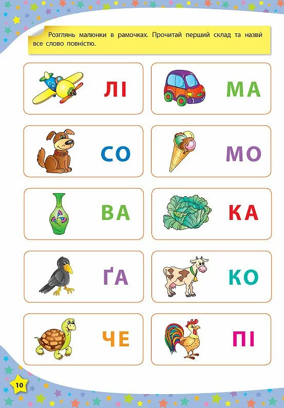 Із цією книгою ваша дитина легко та швидко вивчить букви українського алфавіту, навчиться складати з них склади, потренується читати слова, а також складати їх з наліпок. Книга містить прості й цікаві завдання для розвитку уяви, логіки, мислення та дрібної моторики кисті. Відповідь на кожне завдання малюки зможуть знайти серед 117 наліпок, що містяться в книзі.