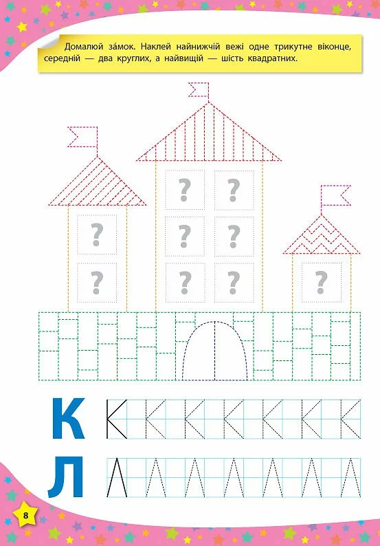 Ця книга допоможе вашій дитині навчитися писати друковані літери українського алфавіту, малювати різні типи ліній, форми й орнаменти, штрихувати зображення, а також малювати предмети за пунктиром і по клітинках. Книга містить прості й цікаві завдання для розвитку уяви, логіки, мислення та дрібної моторики кисті. Відповідь на кожне завдання малюки зможуть знайти серед 117 наліпок, що містяться в книзі.