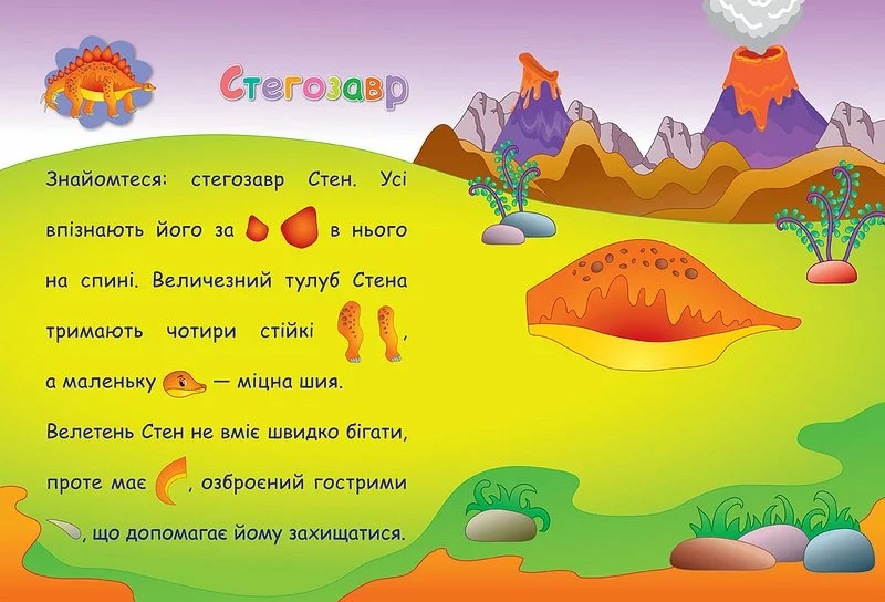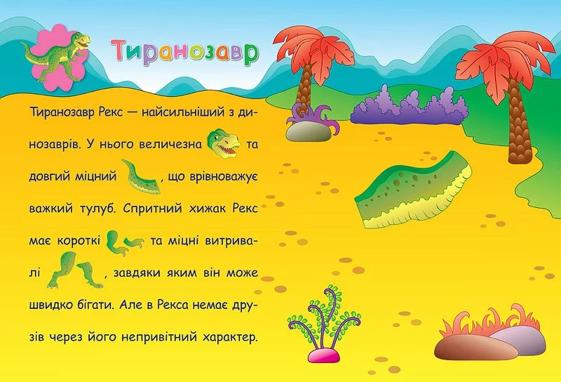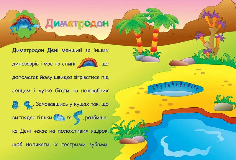 Разом із цим виданням малюк більше дізнається про динозаврів. Прочитайте разом цікаві описи трицератопса, тиранозавра чи диметродона! Користуючись підказками, дитина зможе знайти та додати до малюнку частини тіла динозаврів — лапи, хвости чи голови, щоб зібрати повне зображення. Щоб правильно розмістити наліпки, звертайте увагу на зразок. А ще з наліпок можна зібрати нового, ні на що не схожого динозавра! Створюючи кольорову аплікацію, дитина розвиває дрібну моторику та вчиться співвідносити частину й ціле.