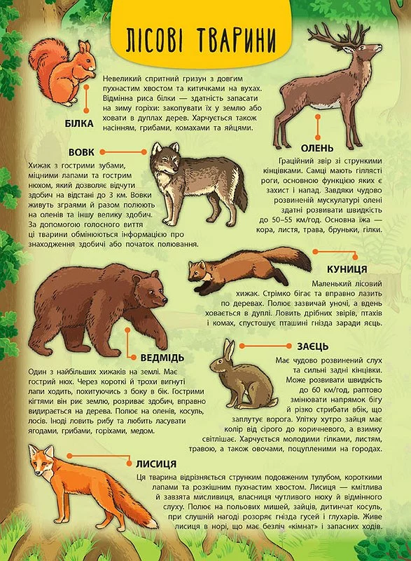 Це видання познайомить дитину зі світом лісу — тваринами, птахами, деревами, ягодами й грибами. У кінці книги малюк знайде захопливу настільну гру, що допоможе весело провести час із друзями, закріпити здобуті знання та пограти з яскравими наліпками, що містяться у виданні.