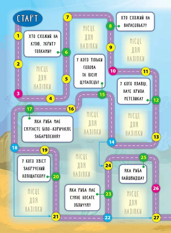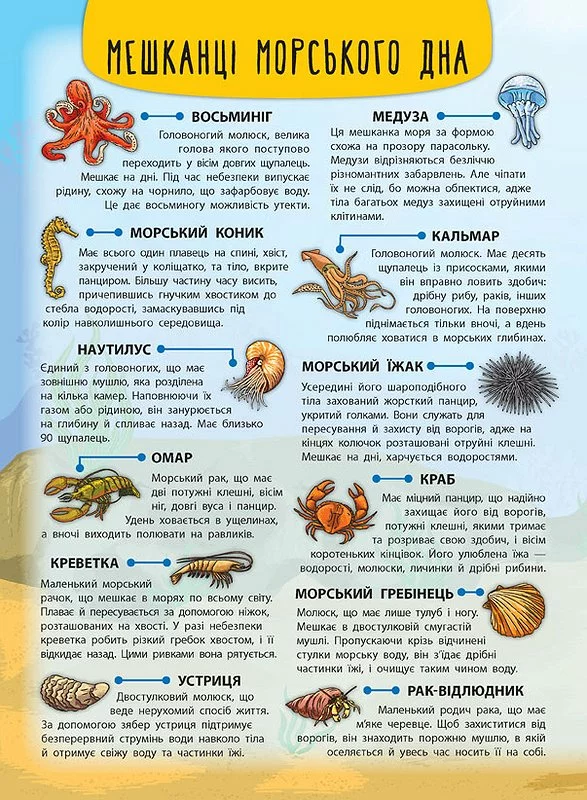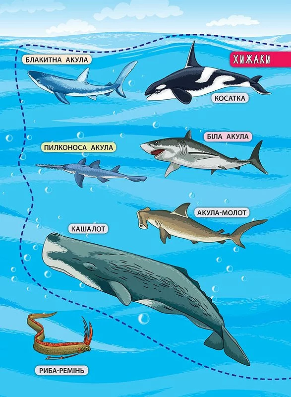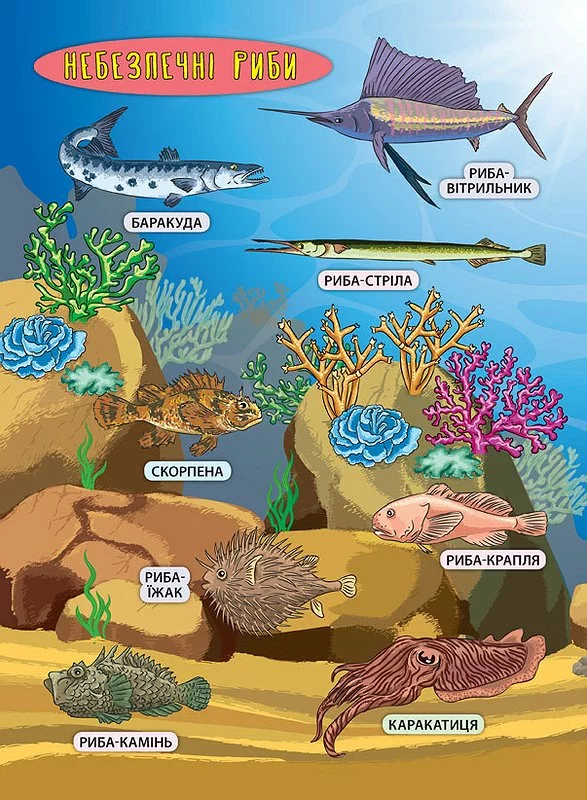 Це видання познайомить дитину із підводним світом — мешканцями морського дна й коралового рифу, небезпечними рибами та морськими хижаками, підводними гігантами. У кінці книги малюк знайде захопливу настільну гру, що допоможе весело провести час із друзями, закріпити здобуті знання та пограти з яскравими наліпками, що містяться у виданні.
