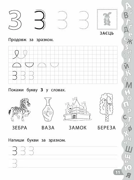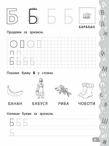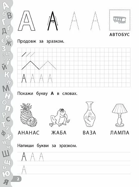 Зошит спрямований на розвиток дрібної моторики й навичок письма, а також вивчення українського алфавіту. Працюючи із цим виданням, дитина зможе не тільки познайомитися з літерами українського алфавіту, навчитися їх писати й поповнити словниковий запас, але й розважитися: виконати захопливі завдання за допомогою наліпок. Прописи призначені для спільної роботи дорослих з дітьми дошкільного віку.